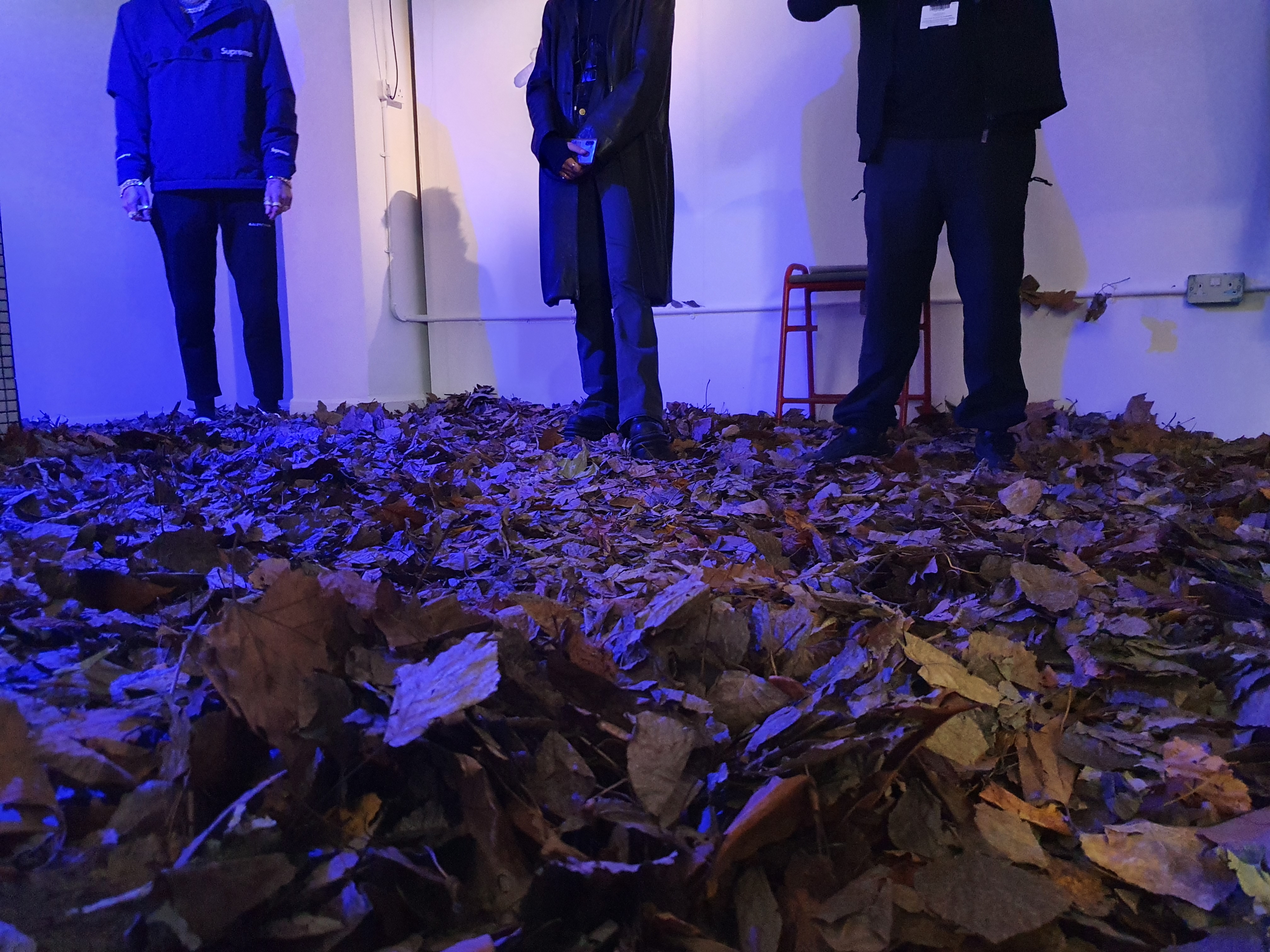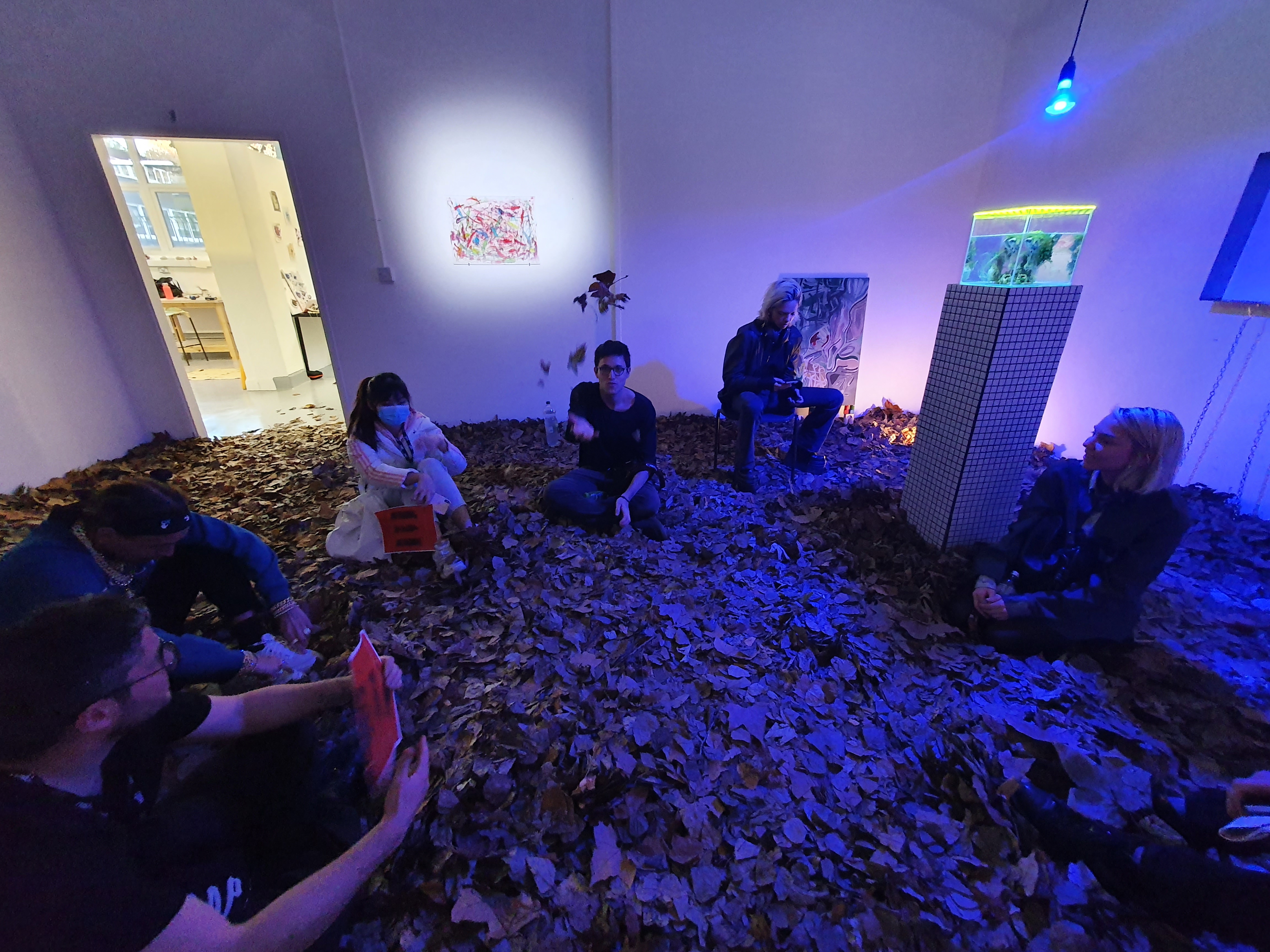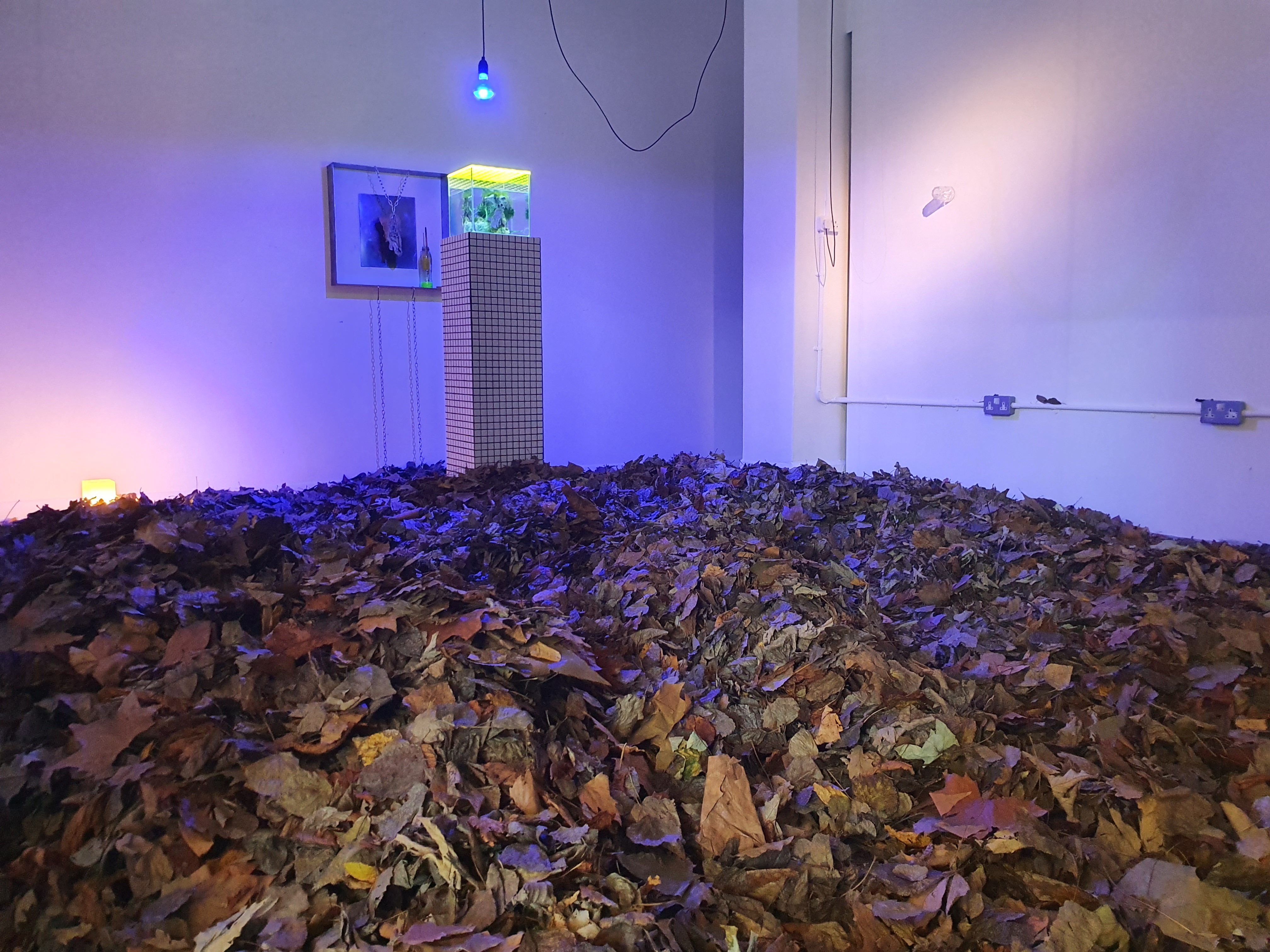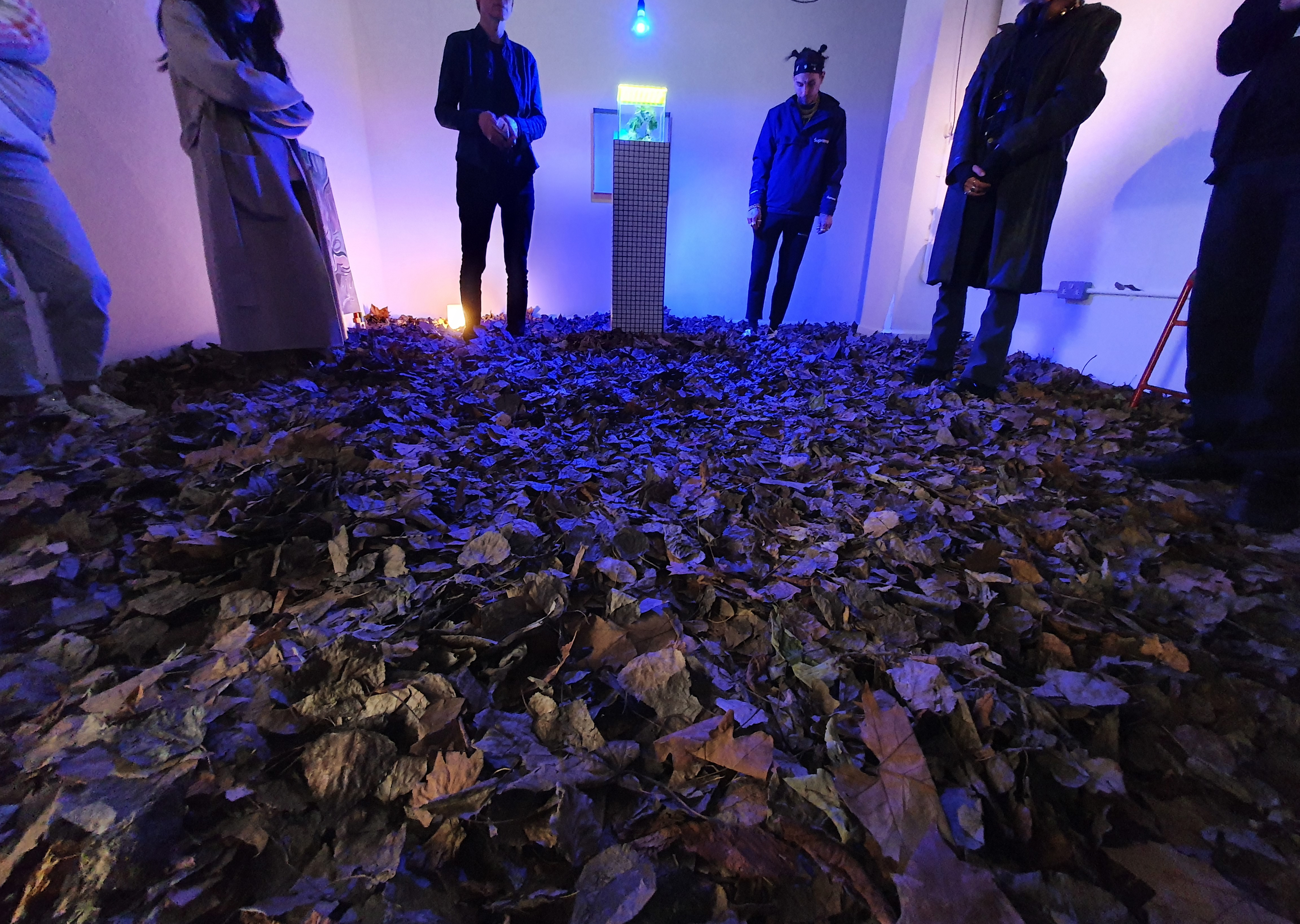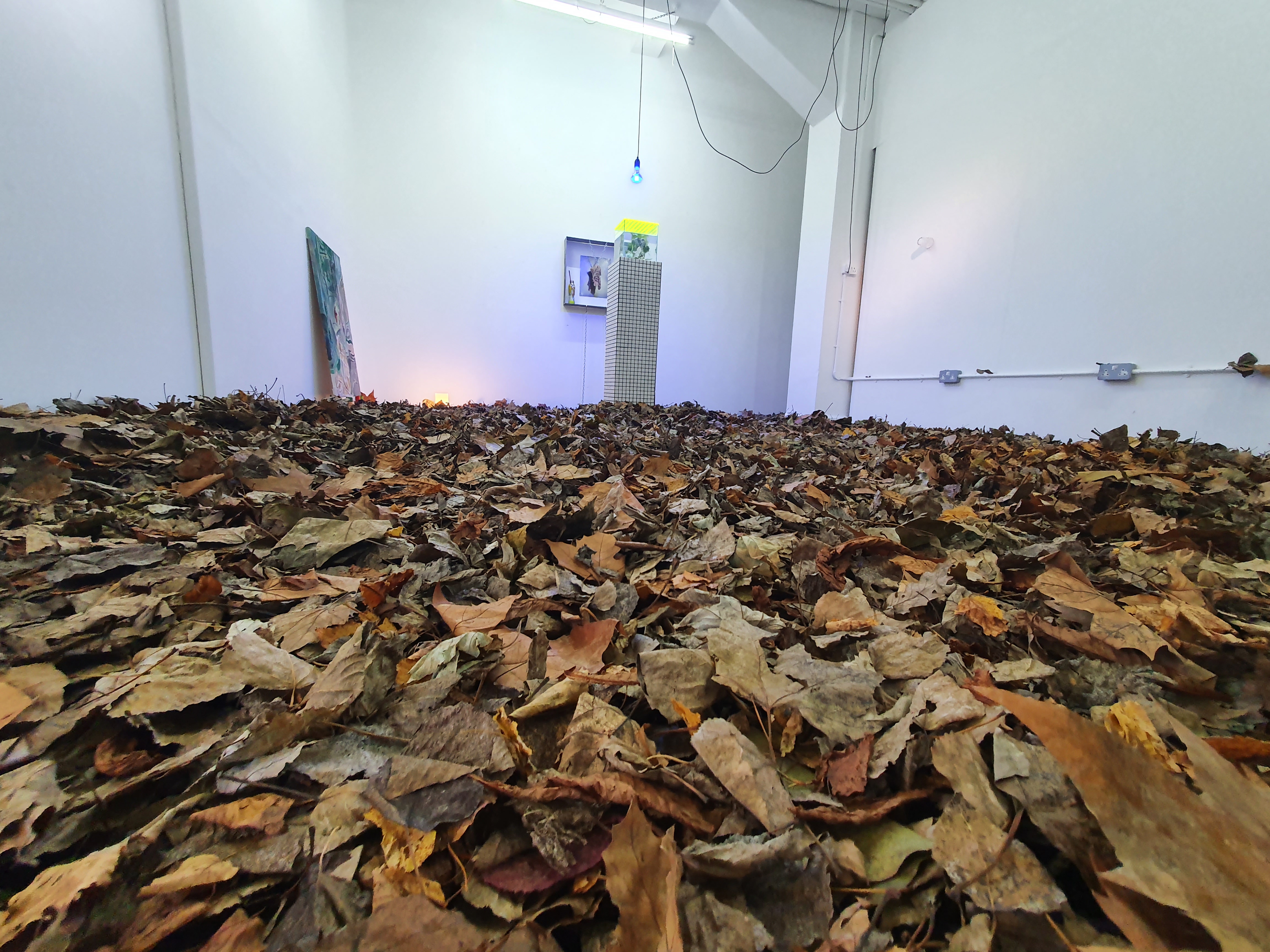 The exhibition space is a white cube space without four seasons. This is an unchangeable place, heaters make the temperature stable, cleaners maintain the tidy room, and the absence of window let it totally separated from the outside. In contrast, outside is a constantly changing world. And autumn is the season of transition. The artwork becomes a transition point between indoor and outdoor. Therefore, it created a surreal and relaxed experience for the audience.