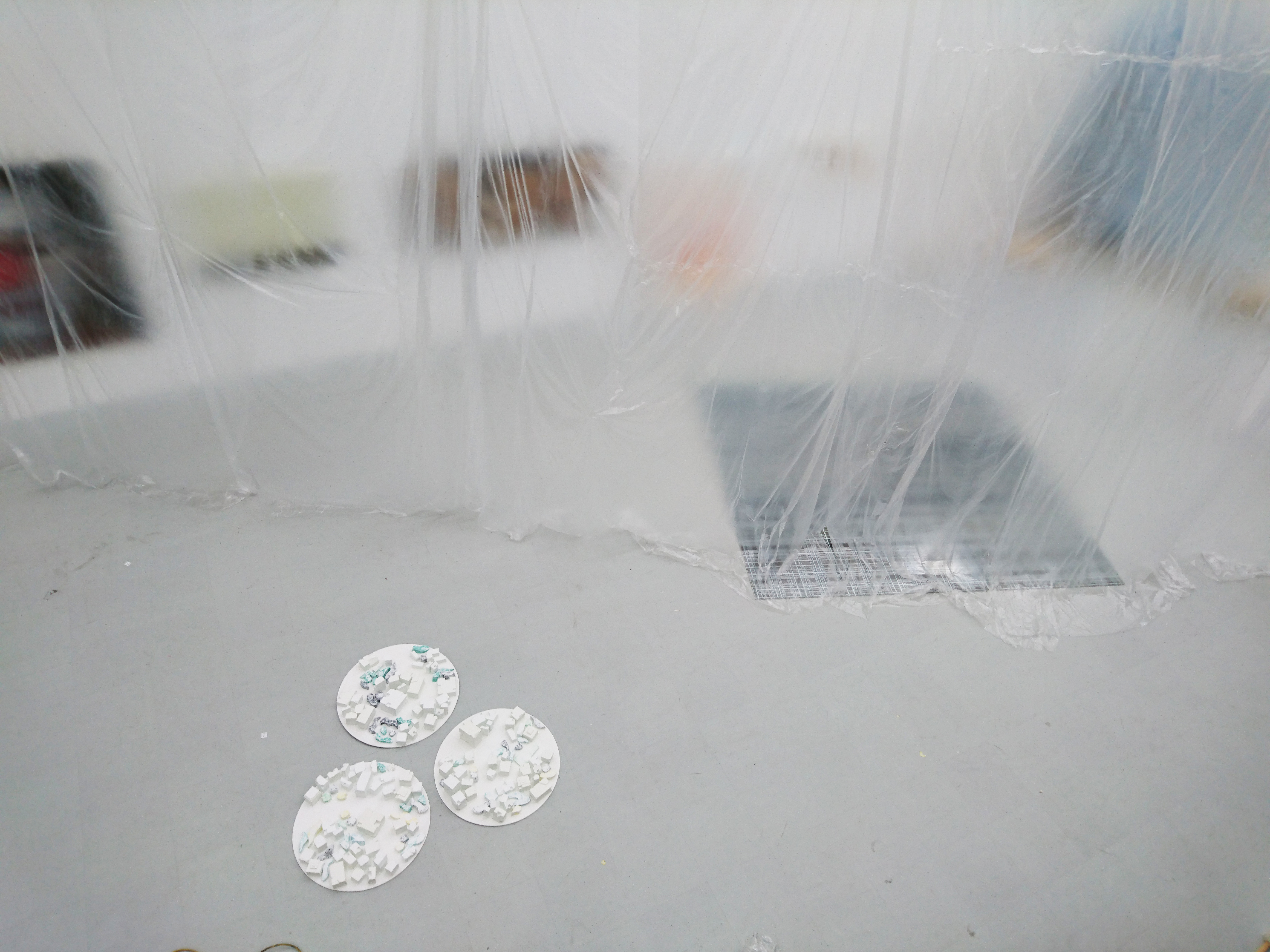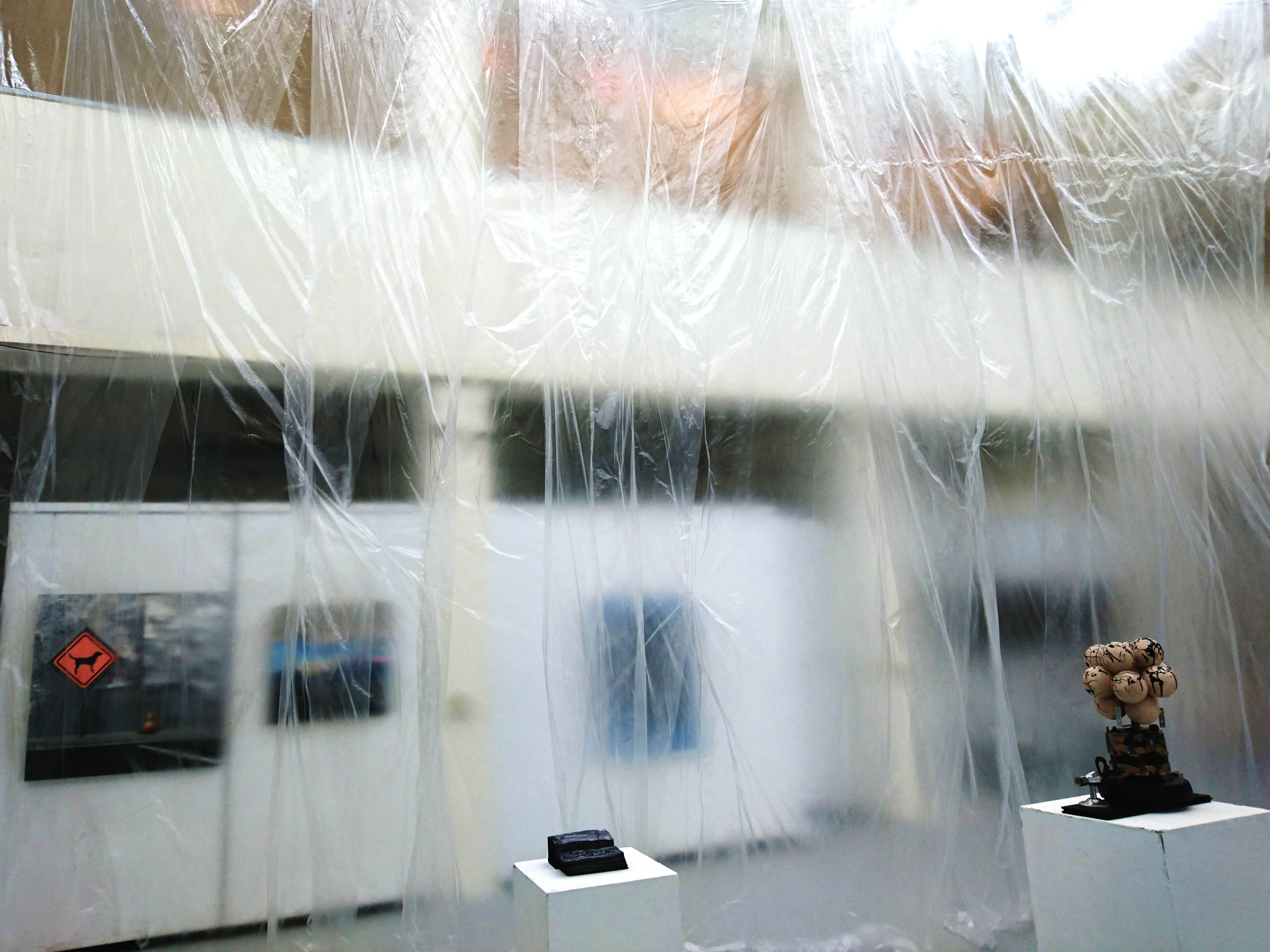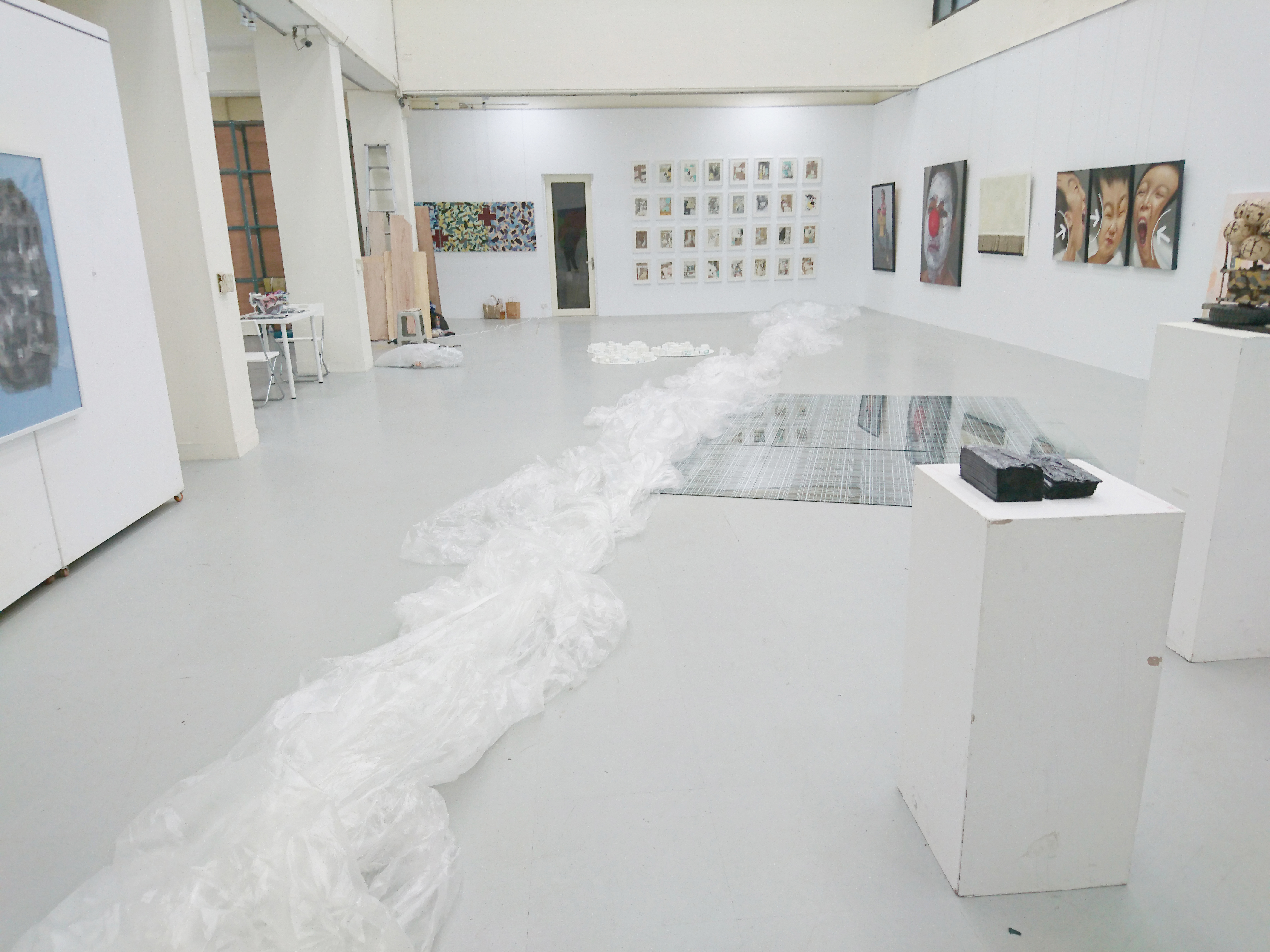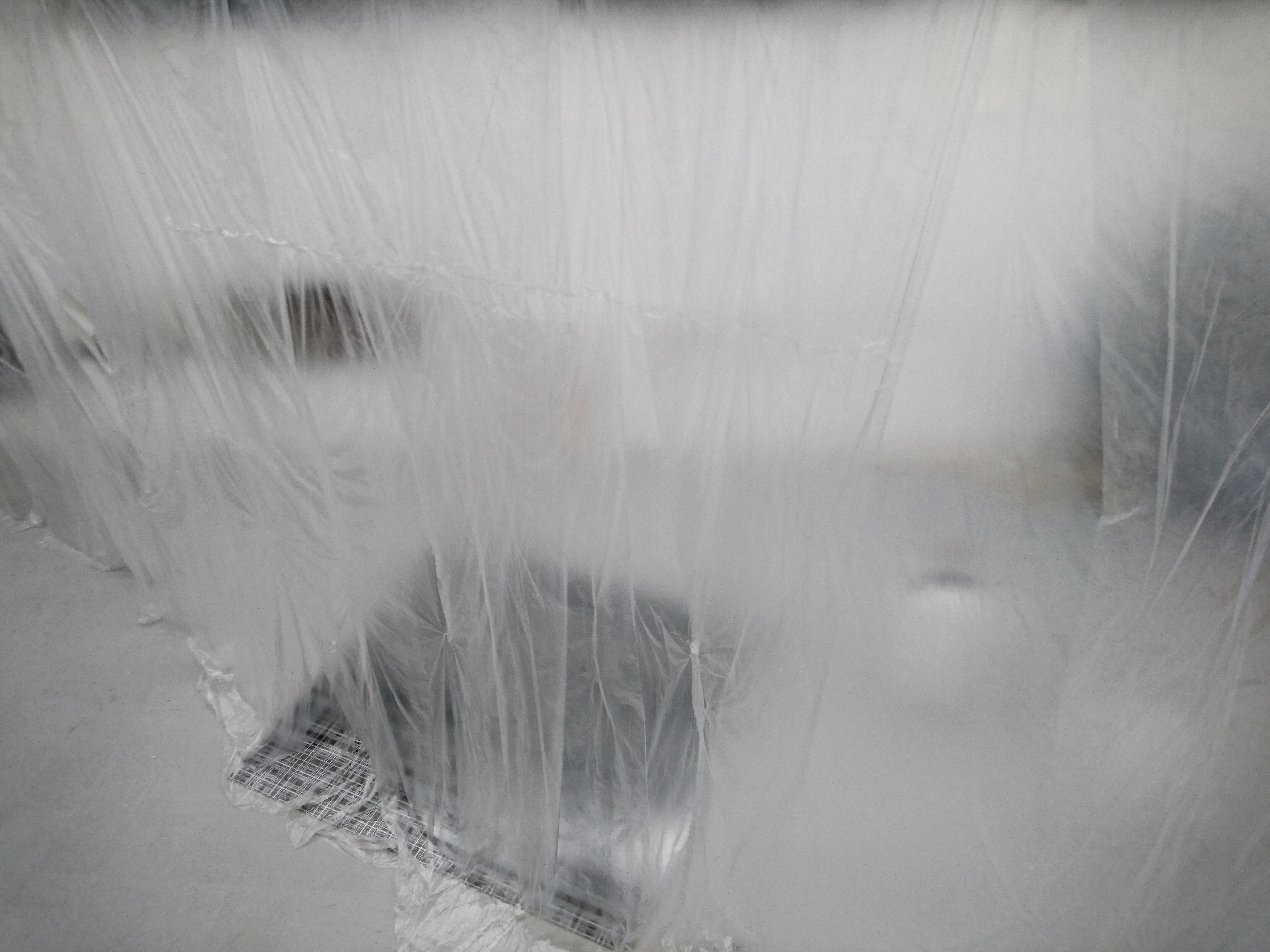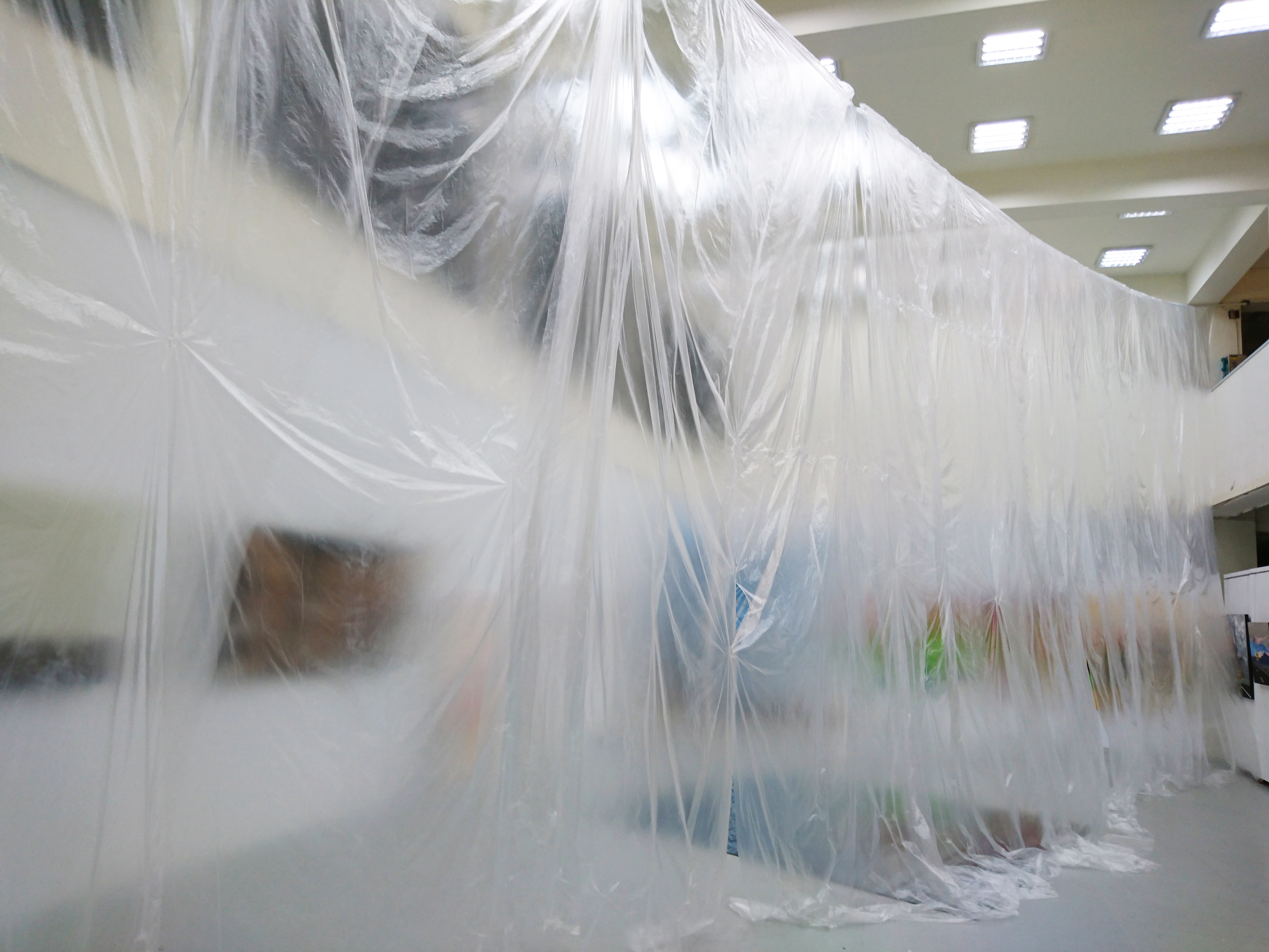 This controversial artwork was used to encourage communication and inspire imagination about the possibility of the space. This artwork as a wall crossed the group exhibition hall from middle changed the exhibition in a direct way. Single material on this scale has its visual effect. This artwork loos almost like mist or waterfall created a landscape inside the exhibition. It’s light and transparent functioned as a veil separates the audience from artworks at the other side offers a different way of looking. After all, it’s not a real wall, not only can the audience see through it, but also able to walk through the gaps between plastic clothes.